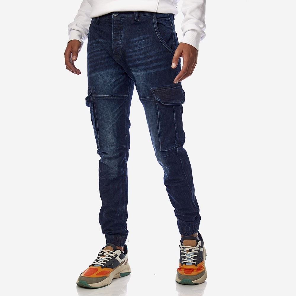 Καθημερινό cargo jean παντελόνι με πλαϊνές τσέπες και φαρδιές πίσω τσέπες σε arc fit. Η εξαιρετική του σχεδίαση με το λάστιχο στους αστραγάλους και τα διακριτικά trendy ξεβάμματα επιτρέπουν ένα νεανικό look.